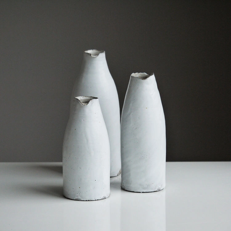 This series of mugs has a humble yet dignified character. The natural texture of the clay peeks out at the base below a layer of calm colored glazing, the edges of the mugs are reminiscent of quarried stone.
